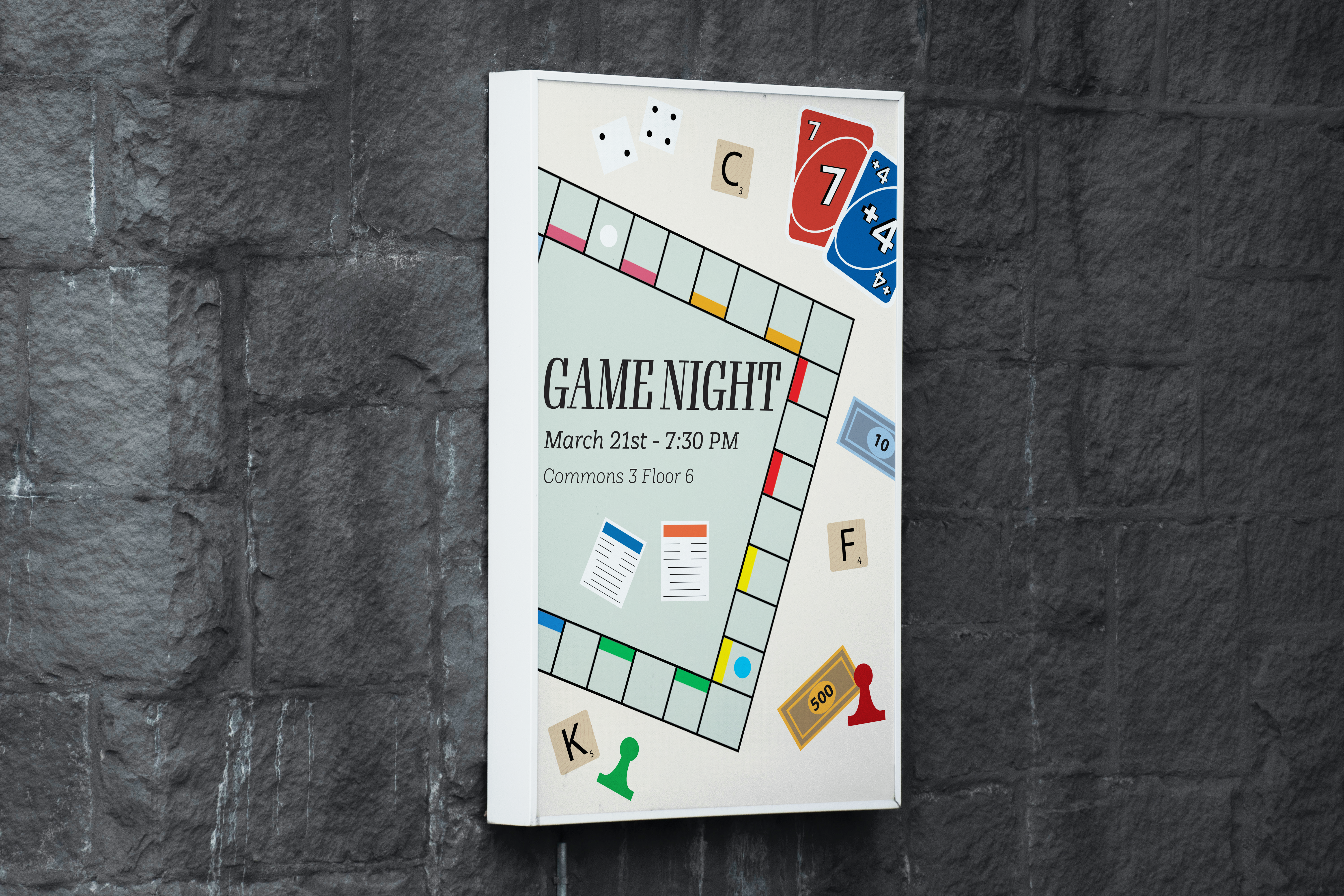 For my poster, I chose a lighter background that contrasted well with the bright colors of the different game pieces. I also used a variety of alignments and sizes for the game pieces, as this helped to convey a “messy” and communal game night setting. Additionally, I aligned my text to the left side of my page, which created a sense of balance between the game pieces and the text. Similarly, using simple font types help to draw the viewers’ eyes away from the “mess” of the game pieces and towards the important information.