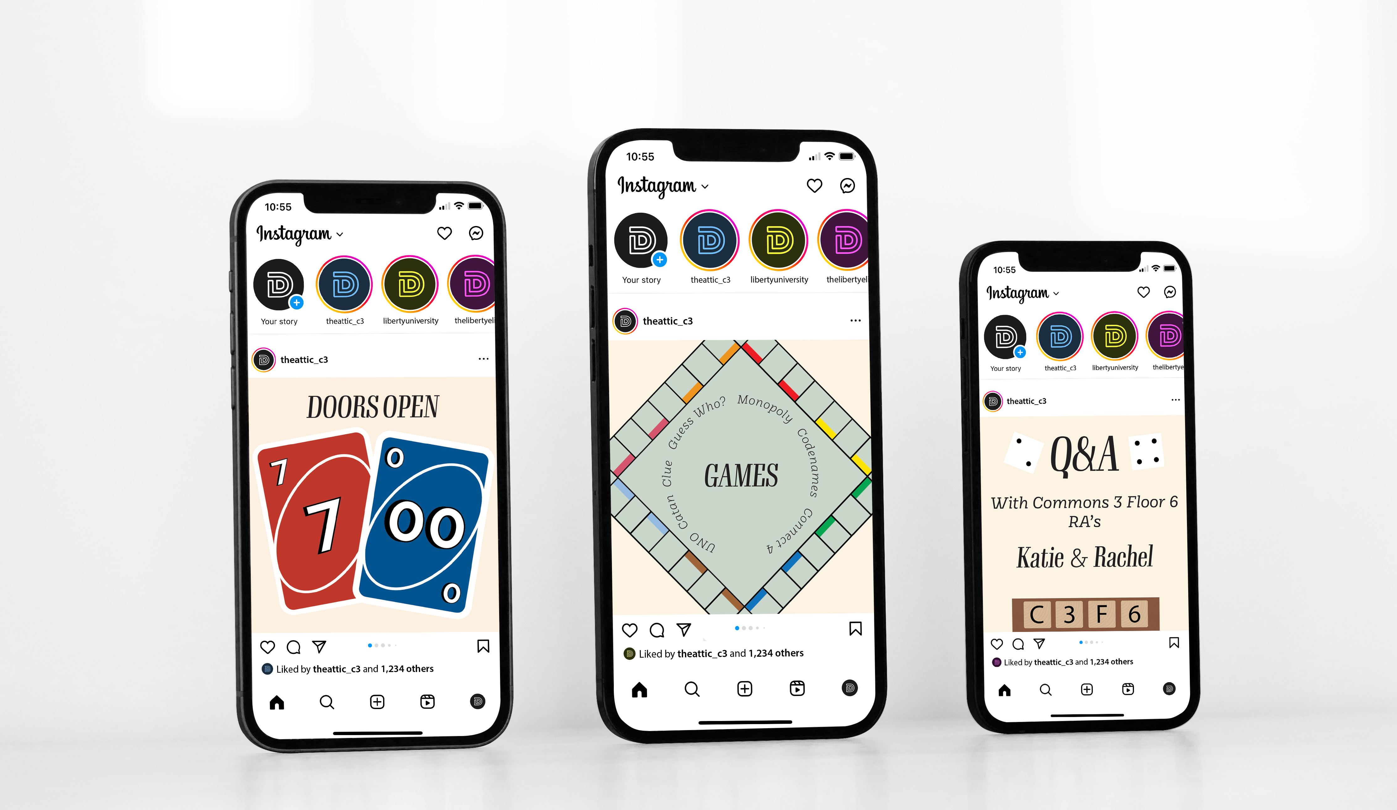 For a project in my Intro to Graphic Design class, I was prompted to plan a fictitious event and create a corresponding poster and three social media posts. The event I chose was a dorm game night.